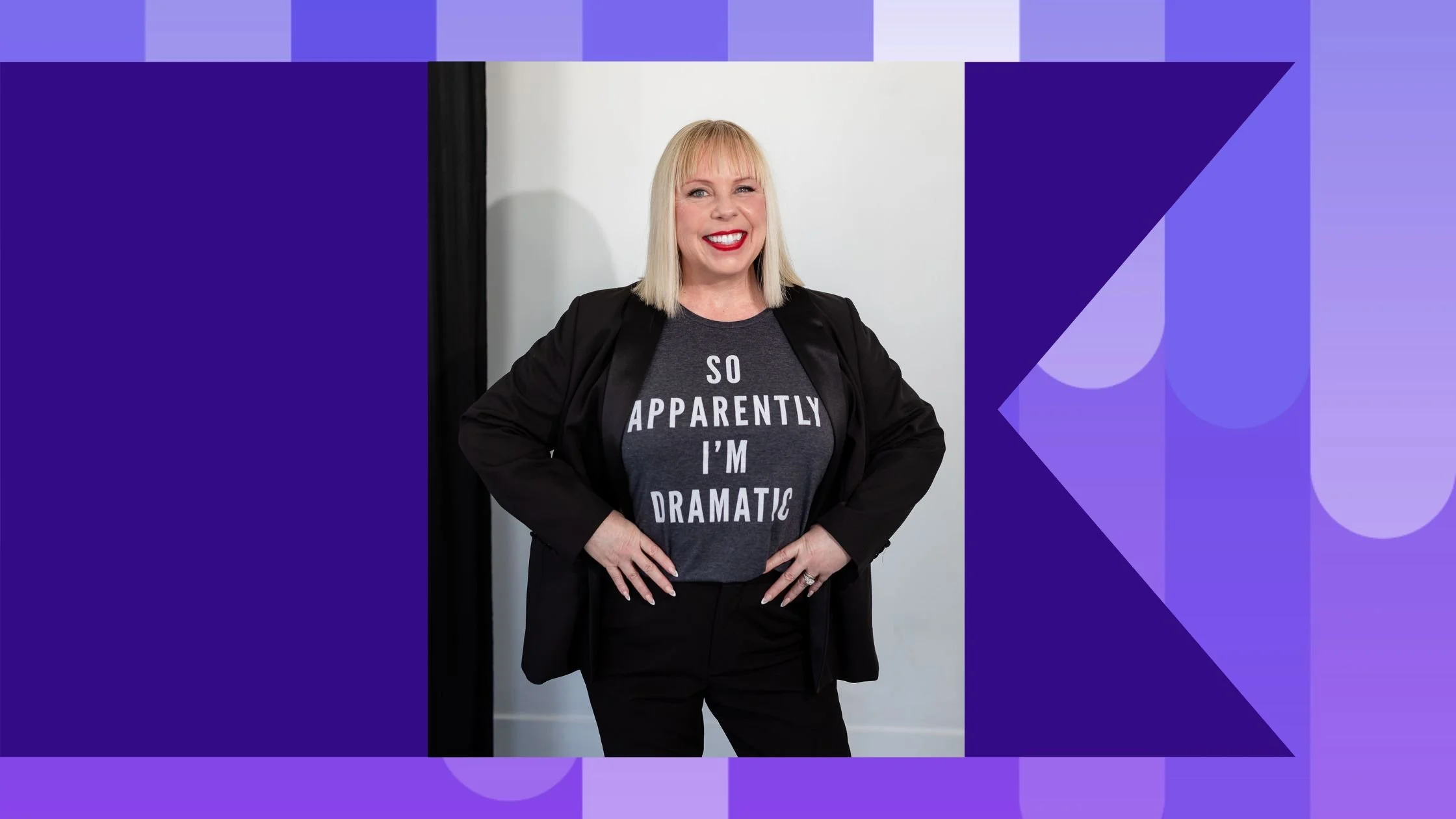 Photo of smiling gorgeous blonde woman wearing a t-shirt that reads, “So apparently I’m dramatic.”